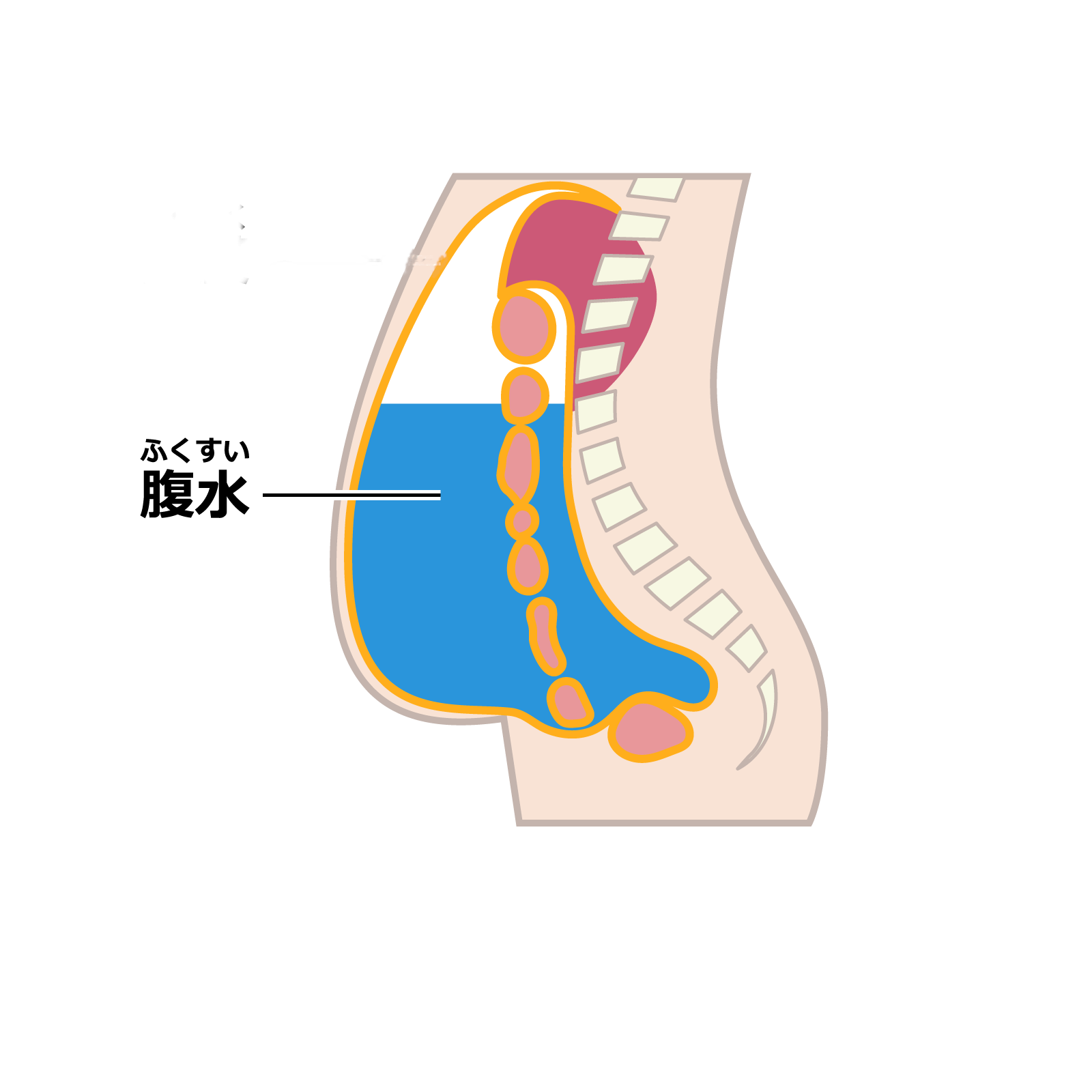 肝硬変や肝がんが末期状態に進行しますと肝不全状態となり、黄疸や腹水貯留、意識障害が進行していきます。